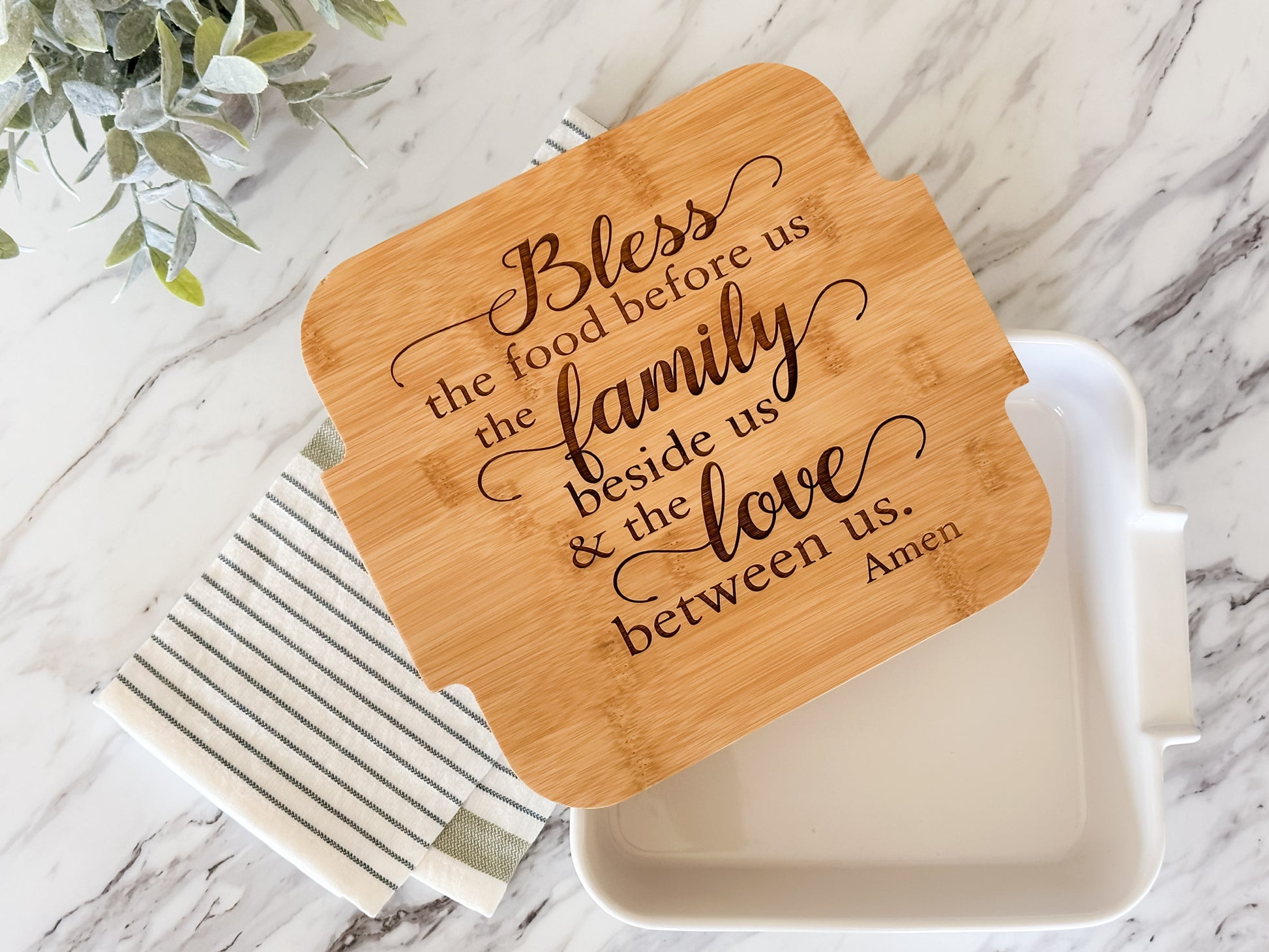 Perfect for family gatherings and potluck events, this casserole dish makes a thoughtful gift or a lovely addition to your own kitchen collection. Featuring an engraved bamboo lid with a beautiful heartfelt blessing.