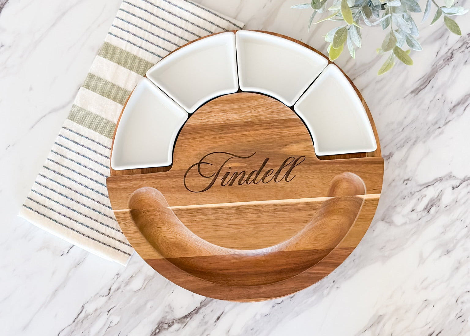 This elegant acacia round charcuterie board set is the perfect centerpiece ideal for entertaining. A stainless steel cheese knives utensil set is included underneath the swivel top board for easy storage. These make great housewarming and wedding gifts!